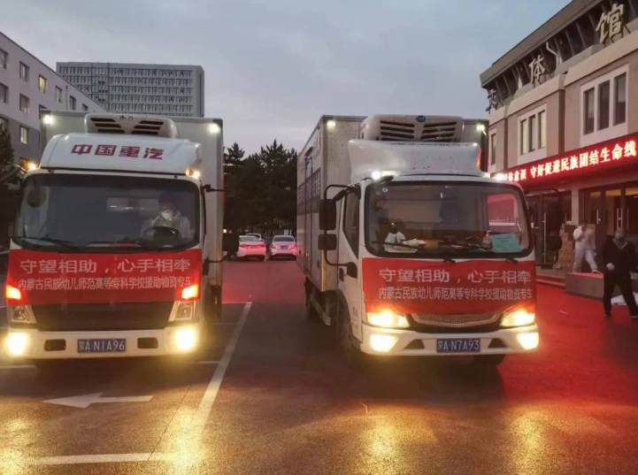 10月7日晚,来自内蒙古民族幼儿师范高等专科学校的两大卡车急缺物资及时送到了内蒙古工业大学,该批物资近14万元,从鄂尔多斯市发出。