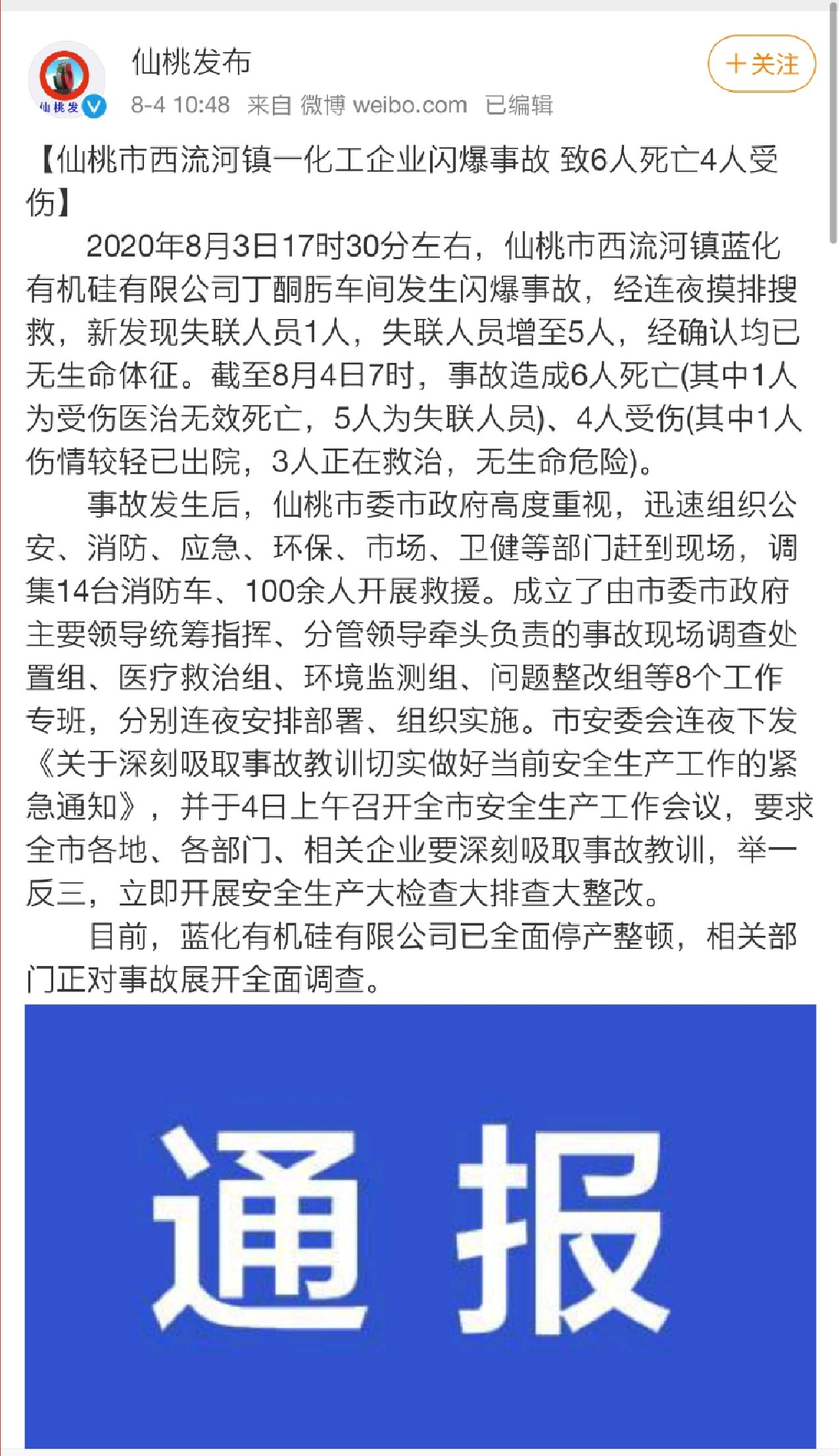 2020年8月3日17时30分左右,仙桃市西流河镇蓝化有机硅有限公司甲基三丁酮甲苯基车间发生闪爆事故,致6人死亡,4人受伤。