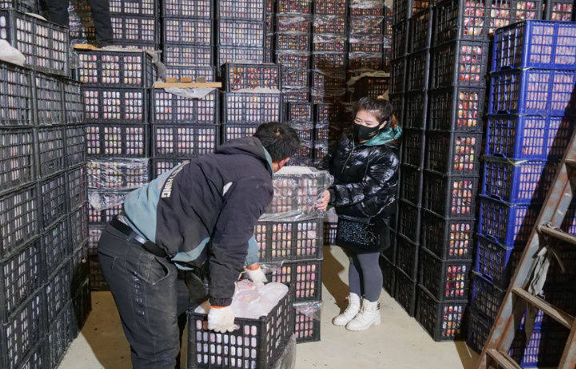 春节临近,在通辽市开鲁县麦新镇义和沙拉村的冷库里,几名搬运工正在米学娇的指挥下往冷藏车上搬运鸡心果等果品。米学娇骄傲地告诉记者,她们村出产的小苹果,已经闯进南方大市场。