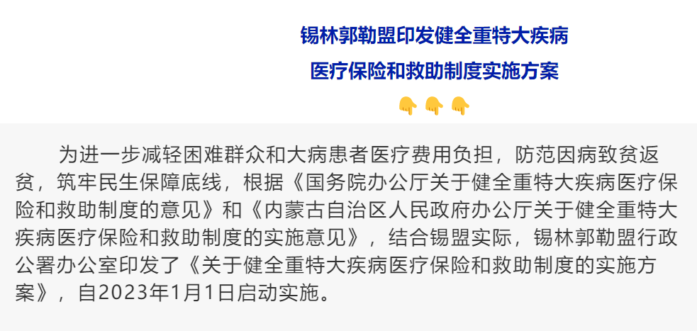 为进一步减轻困难群众和大病患者医疗费用负担,防范因病致贫返贫,筑牢民生保障底线,根据《国务院办公厅关于健全重特大疾病医疗保险和救助制度的意见》和《内蒙古自治区人民政府办公厅关于健全重特大疾病医疗保险和救助制度的实施意见》,锡林郭勒盟结合实...