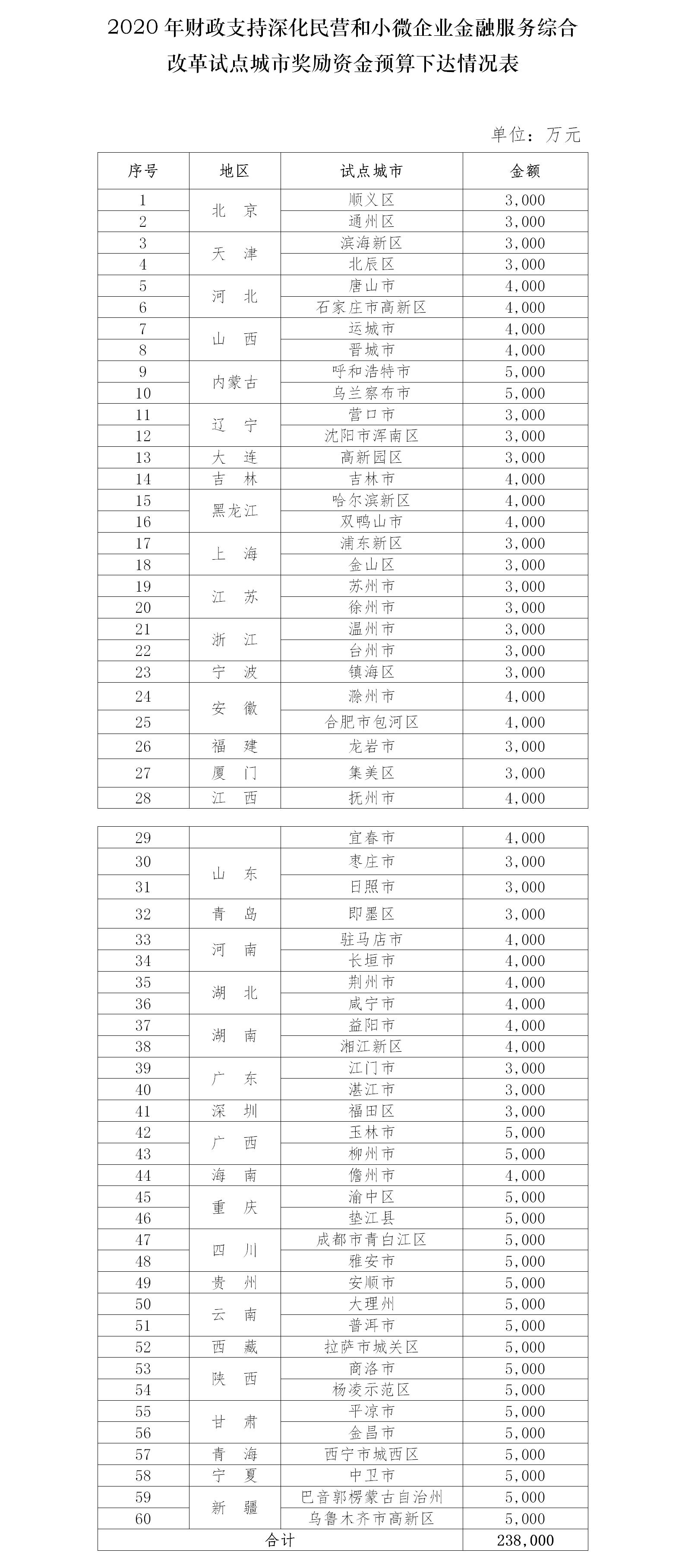 2020年度财政支持深化民营和小微企业金融服务综合改革试点城市奖励资金预算下达情况表(来源:财政部)