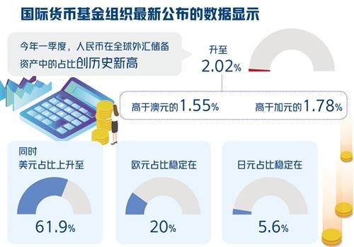 国际货币基金组织(IMF)最新公布的数据显示,今年一季度,人民币在全球外汇储备资产中的占比升至2.02%,创历史新高。对此,业内专家表示,人民币在全球外汇储备占比升高,意味着国际市场对人民币资产越来越感兴趣。当前人民币汇率保持稳定,且中外利差保持高位,带来了相当的吸引力,人民币资产正逐步成为全球资产“避风港”。