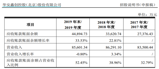 但其实从细节数据来看,华安鑫创在2018年和2019年的应收账款大幅增加,2017年到2019年的应收账款余额分别高达2.74亿元、3.36亿元和4.49亿元,逐年大幅增加;特别是2019年,华安鑫创在营业收入小幅减少0.8%的基础上,应收账款余额却大幅增长了三分之一,导致应收账款账面余额占营业收入比例猛增。