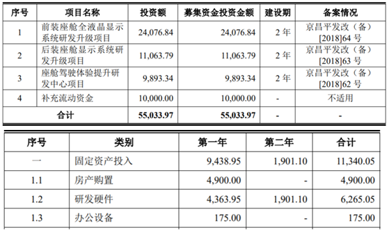 另据招股书显示,本次华安鑫创申请上市计划募集资金投入到3个生产性项目中,设计总投资金额高达5.5亿元。其中“前装座舱全液晶显示系统研发升级项目”涉及投资额最大,达2.41亿元,其中包含了硬件设备投资金额就达6265.05万元;据招股书披露,该项目预计新增营业额5.8亿元/年、税后利润4745.82万元。