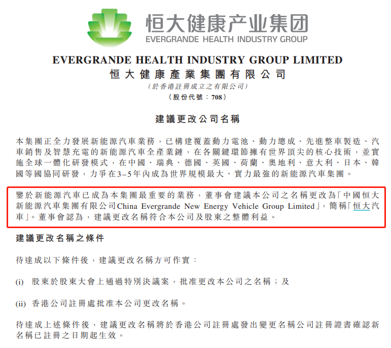 7月27日,恒大健康公告称,鉴于新能源汽车已成为集团最重要的业务,董事会建议将公司名称更改为“中国恒大新能源汽车集团有限公司”,简称“恒大汽车”。