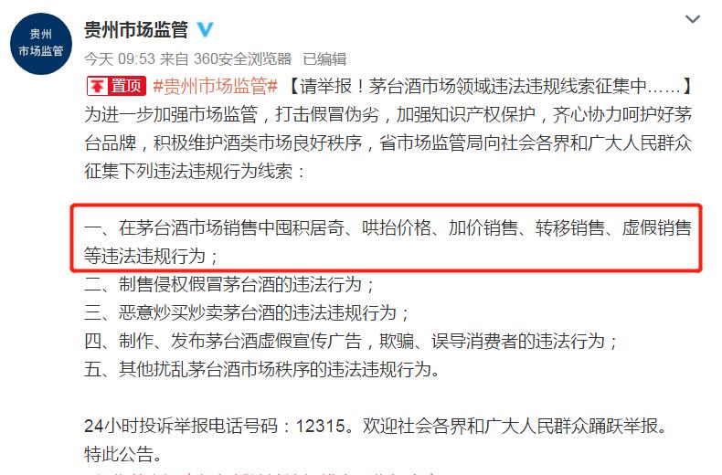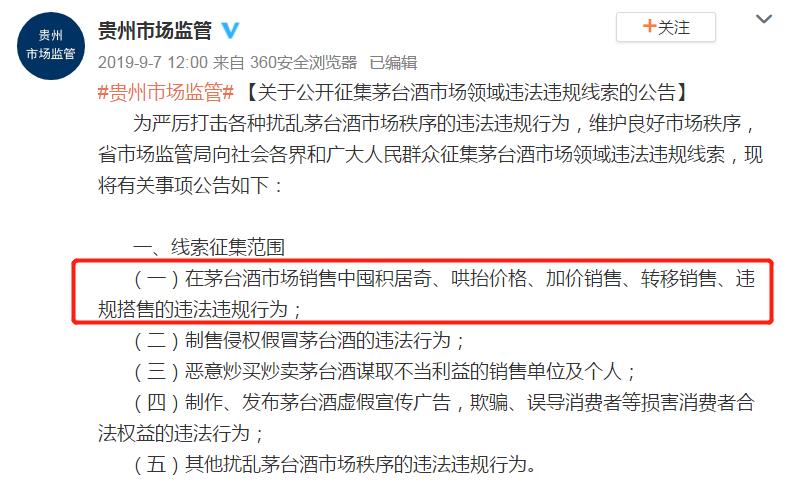值得一提的是,2019年9月7日,贵州省市场监管局也发布了关于公开征集茅台酒市场领域违法违规线索的公告。