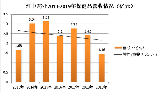 2014-2019年,保健品业务的营收分别为3.04亿元、3.13亿元、2.4亿元、2.76亿元、2.42亿元、1.46亿元,毛利率从2011年的75.02%下滑至2019年的46.06%。