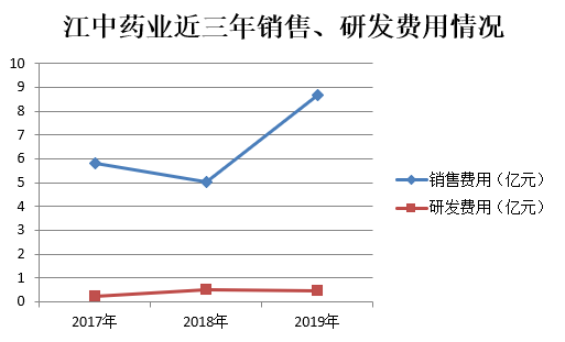 据财报显示,2017年-2019年期间,江中药业销售费用分别为5.83亿元、5.03亿元、8.69亿元。同期,公司的研发费用分别为2278万元、2962万元、4751万元。销售费用保持在较高的水平,基本是研发费用的15倍左右。