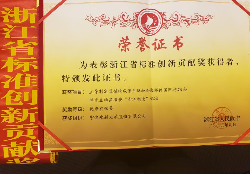 9月25日,在浙江省杭州市召开的全省质量大会上,宁波永新光学股份有限公司(以下简称“永新光学”)荣获2020年浙江省标准创新贡献奖,获奖项目为主导制定显微镜成像系统和成像部件国际标准和荧光生物显微镜“浙江制造”标准,获奖等级为“优秀贡献奖”。
