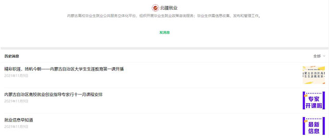 11月9日,内蒙古自治区高校学生就业创业服务中心的公众号“北疆就业”发布了“内蒙古自治区高校就业创业指导专家行”十一月的课程安排,高校毕业生登陆北疆就业平台即可学习专业的求职就业课程。