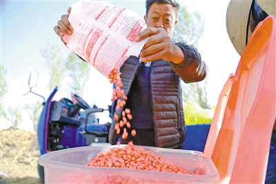 荒地窑村农民张瑞军为播种机补加玉米种子。