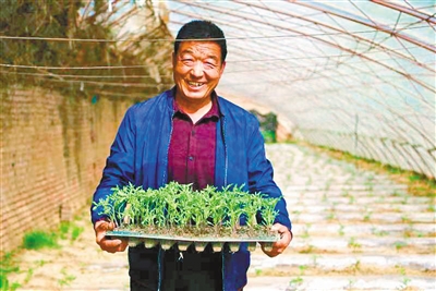 大羊场村党支部书记樊四清手捧西红柿秧露出了灿烂笑容。