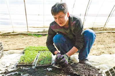 西瓜秧苗长势喜人,村民吕永胜很开心。据他介绍,近期风力较大,西瓜秧苗刚刚发芽,相对来讲比较脆弱,因此需要不断检查和加固暖棚,让西瓜秧苗度过危险期。