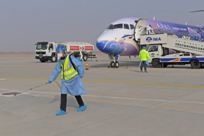 11月18日上午10:40,Eu1909次航班经过平稳的滑行,准时停在巴彦淖尔机场停机坪,来自成都的旅客依次走出机舱。旅客离开后,工作人员在飞机附近认真消毒。