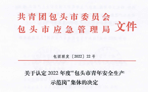 11月10日,中国二冶收到共青团包头市委员会、包头市应急管理局认定决定,认定中国二冶城建分公司包头科田项目部、冶金分公司110国道管廊项目部、钢构分公司焊接实验室三个集体为2022年度“包头市青年安全示范岗”集体荣誉称号。