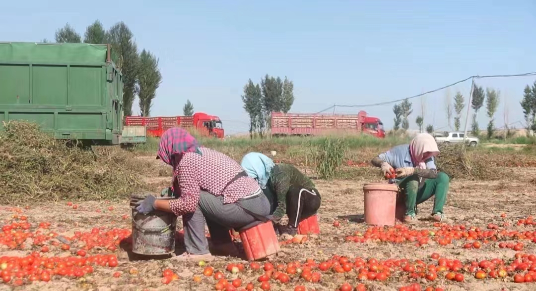 丰收时节,五原县万余亩番茄硕果累累,丰收在望。大型番茄采收机正配合着卡车来回穿梭、隆隆作响,火红的番茄被卷进采收机,经过筛选后,成熟的果实输送到旁边的卡车里。