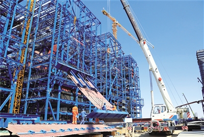 4月27日,工作人员在呼和浩特市托克托县内蒙古久泰新材料有限公司年产100万吨煤制乙二醇项目建设现场进行吊装。