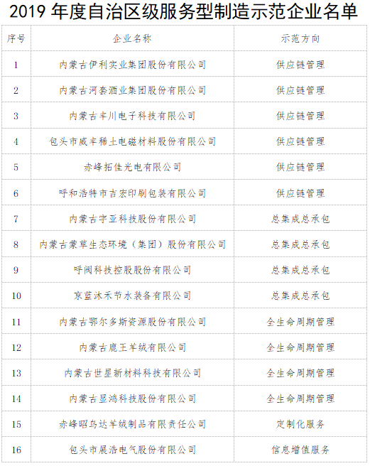 为推动我区制造业由生产型制造向服务型制造转变, 日前,自治区工信厅公布了2019年度自治区级服务型制造示范企业名单,内蒙古伊利实业集团股份有限公司等16户企业上榜。