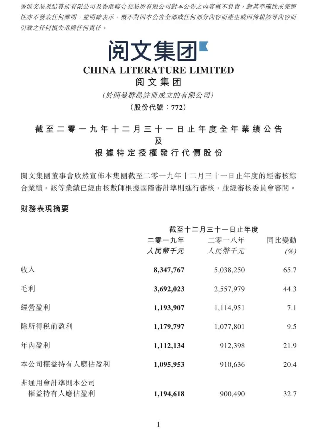 手握国内最多IP的阅文集团在近日公布了其截止2019年12月31日的全年业绩公告。财报显示,阅文集团2019年全年营收83.48亿人民币,同比增长65.7%;净利润11.12亿人民币,同比增长21.9%,公司权益持有人应占盈利10.96亿人民币,同比增长20.4%。