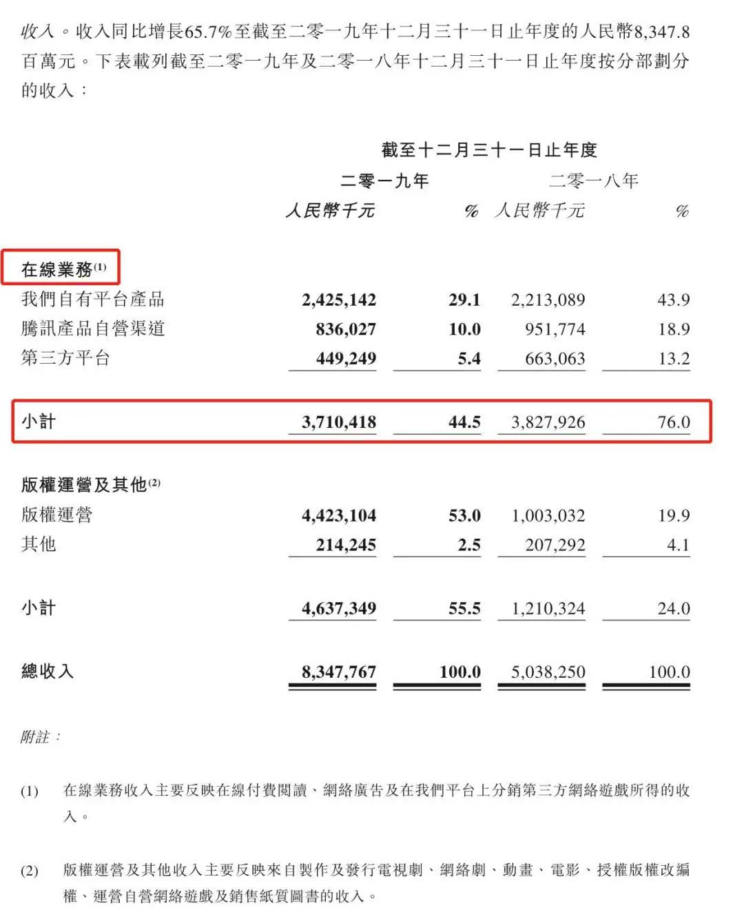 (阅文集团2019年年报显示,在线业务相比2018年出现下滑)