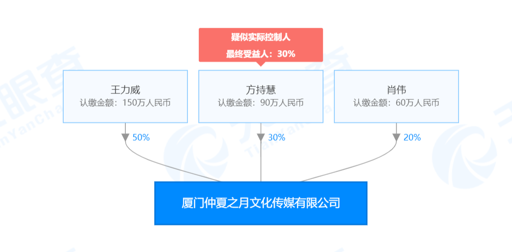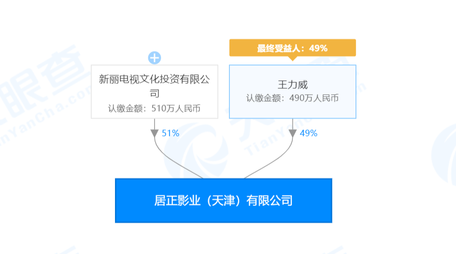通过天眼查发现,这家疑似肖战工作室的公司的股权结构中,一位持股50%的股东王力威,同时也是新丽传媒旗下子公司居正影业(天津)有限公司的股东,持有居正影业49%的股份,也是该公司的最终受益人。