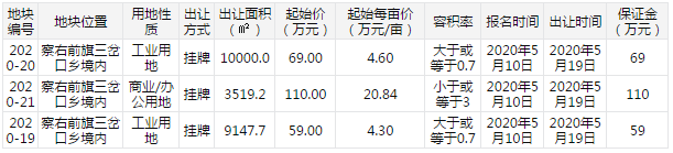该地块位于察右前旗三岔口乡境内,为工业用地,出让年限为50年,出让总用地面积为10000.0㎡,建设用地面积为10000.0㎡,容积率为大于或等于0.7,起始价为69.00万元(4.60万元/亩),报名时间2020年5月10日,出让时间2020年5月19日,需缴纳的保证金为69万元。 (2)编号为2020-21的察右前旗三岔口乡境内地块 该地块位于察右前旗三岔口乡境内,为商业/办公用地,出让年限为40年,出让总用地面积为3519.2㎡,建设用地面积为3519.2㎡,容积率为小于或等于3,起始价为110.00万元(20.84万元/亩),报名时间2020年5月10日,出让时间2020年5月19日,需缴纳的保证金为110万元。 (3)编号为2020-19的察右前旗三岔口乡境内地块 该地块位于察右前旗三岔口乡境内,为工业用地,出让年限为50年,出让总用地面积为9147.7㎡,建设用地面积为9147.7㎡,容积率为大于或等于0.7,起始价为59.00万元(4.30万元/亩),报名时间2020年5月10日,出让时间2020年5月19日,需缴纳的保证金为59万元。