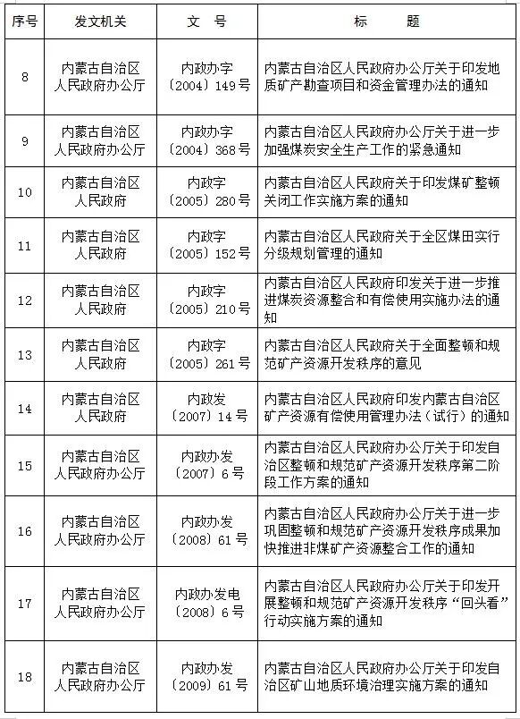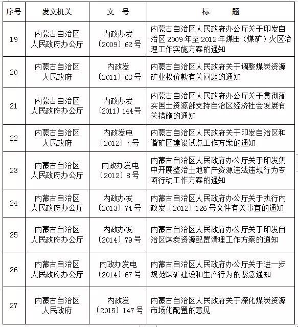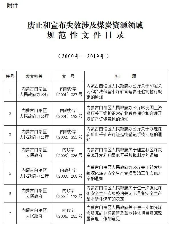 按照党中央、中央纪委国家监委关于开展煤炭资源领域违规违法问题专项整治要求,根据《内蒙古自治区规范性文件制定和备案监督办法》(内蒙古自治区人民政府令第191号)规定,自治区人民政府决定废止和宣布失效《内蒙古自治区人民政府办公厅关于印发关闭和合法保留小煤矿管理责任追究暂行规定的通知》(内政办字〔2001〕337号)等27件涉及煤炭资源领域规范性文件。一、废止和宣布失效的27件规范性文件,自本决定发布之日起停止执行。各地区、各部门和单位不得继续作为行政管理依据。