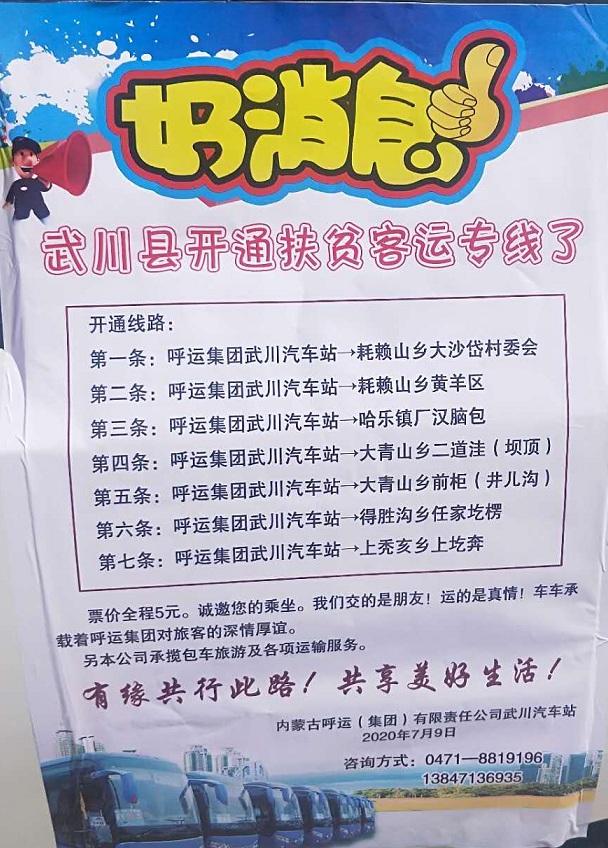 武川县:共有9个乡镇和93个建制村,本次设置8条扶贫专线,覆盖存在通返不通的乡镇1个、建制村49个,拟定日发1班,暂定票价为50公里以内(含50公里)票价5元,50公里以上票价10元。