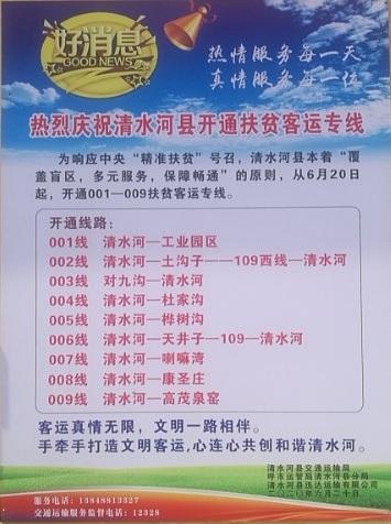 清水河县:共有8个乡镇和102个建制村,本次设置9条扶贫专线,覆盖27个通返不通的行政村,拟定日发1班,暂定票价为30公里以内(含30公里)5元,30公里至55公里(含55公里)10元,55公里以上15元。