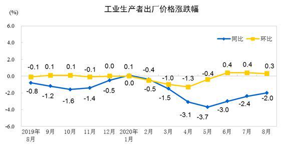 国家统计局今日公布数据显示,2020年8月份,全国工业生产者出厂价格(PPI)同比下降2.0%,降幅比上月收窄0.4个百分点,PPI环比上涨0.3%。
