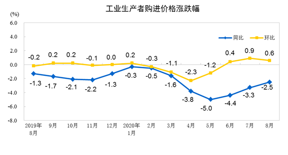 工业生产者购进价格同比下降2.5%,环比上涨0.6%。1到8月平均,工业生产者出厂价格(PPI)比去年同期下降2.0%,工业生产者购进价格下降2.7%。