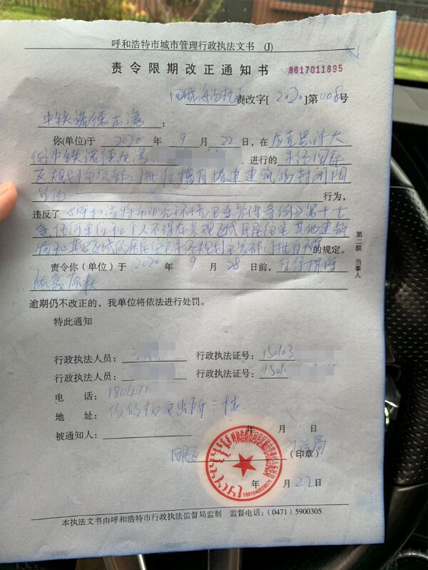 “当时我去后,他们告诉我这个事情应由呼和浩特市回民区攸攸板镇城管中队(以下简称攸攸板镇城管中队)负责,于是我又去了攸攸板镇城管中队,执法人员在了解完情况后,和我一起到了小区与李林沟通,在李林家封闭式阳台的墙壁上喷了两个‘拆’字,也向李林下达了《责令限期改正通知书》。”刘云告诉晨报融媒记者。