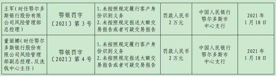 1月18日,人民银行鄂尔多斯市中心支行因鄂尔多斯银行股份有限公司存在“未按照规定履行客户身份识别义务;未按照规定报送大额交易报告或者可疑交易报告”等2项违法行为,罚款40万元。同日,对时任鄂尔多斯银行行长左中海罚款人民币3万元,对时任鄂尔多斯银行风险管理部总经理王军罚款人民币2万元,对时任鄂尔多斯银行风险管理部副总经理、反洗钱中心主任董丽娜罚款人民币2万元。