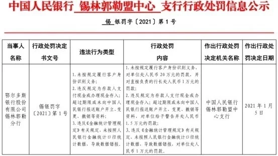 1月5日,中国人民银行锡林郭勒盟中心支行因鄂尔多斯银行股份有限公司锡林郭勒分行存在“未按规定履行客户身份识别义务;违反规定为存款人支付现金或办理现金存入;超过期限或未向中国人民银行报送账户开立、变更、撤销等资料;违反《金融统计管理规定》有关规定,未按照人民银行金融统计口径统计数据,导致数据错报”的违法违规行为,罚款22.5万元;