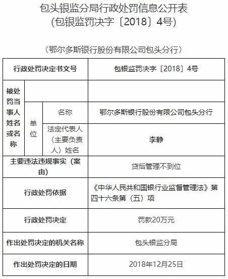 1月18日,银保监会网站公布行政处罚决定,鄂尔多斯银行股份有限公司包头分行存在贷后管理不到位的违法违规事实。包头银监分局对其罚款20万元;