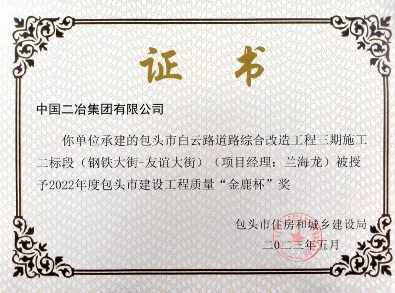5月26日,中国二冶收到包头市住房和城乡建设局颁发的荣誉证书,中国二冶包头市白云路道路改造工程喜获2022年度包头市“金鹿杯”工程质量奖。