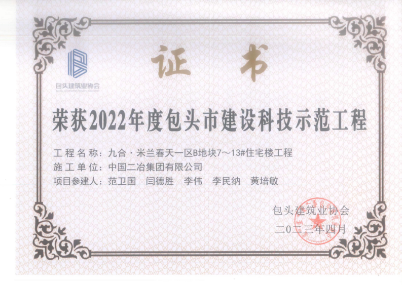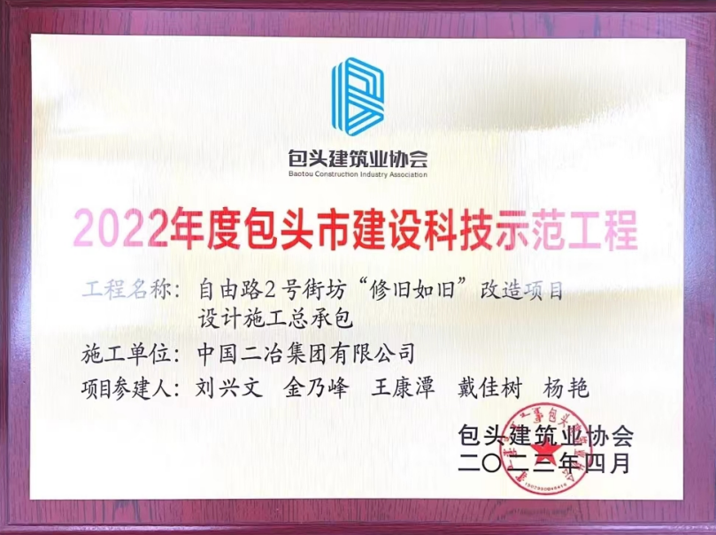 5月28日,中国二冶收到包头市建筑业协会颁发的荣誉证书,中国二冶承建的米兰春天房地产项目续建工程、大地熊(包头)科技有限公司5000吨高端制造高性能稀土永磁材料及器件工业项目、自由路2号街坊“修旧如旧”改造项目设计施工总承包项目荣获“2022年度包头市建设科技示范工程”。