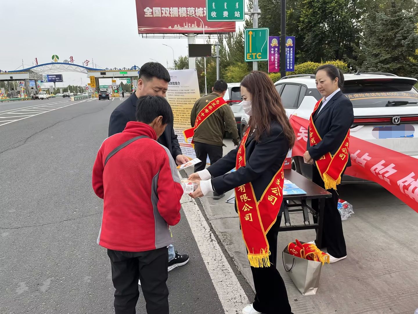 阳光财险乌兰察布中心支公司在集宁高速入口处开展“金融宣传不打烊,知心阳光伴您行”现场宣传活动,针对“国庆中秋”节后返城、返乡、返校的金融消费者,公司精心准备了矿泉水、泡面、面包等旅程必需品,同时现场发放反洗钱、金融风险提示、消费者权益保护等金融宣传折页、物资并进行现场讲解,向广大金融消费者普及金融知识的同时,也让他们感受到了阳光保险的知心服务。