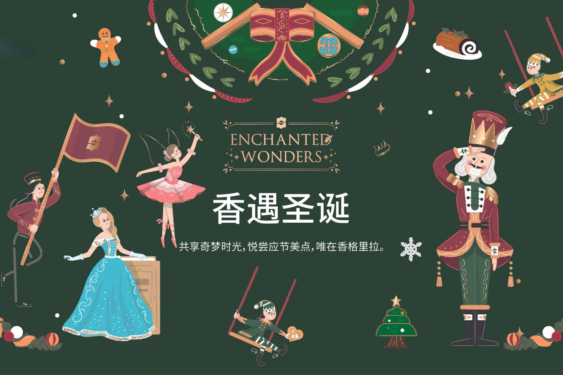 精彩缤纷的十二月已经到来,在这个梦幻的季节里,让胡桃夹子先生将作为向导,带您进入香格里拉的童话国度。从点灯仪式、节庆表演、应节美点到琳琅美馔,为每个家庭带来欢愉和喜悦。