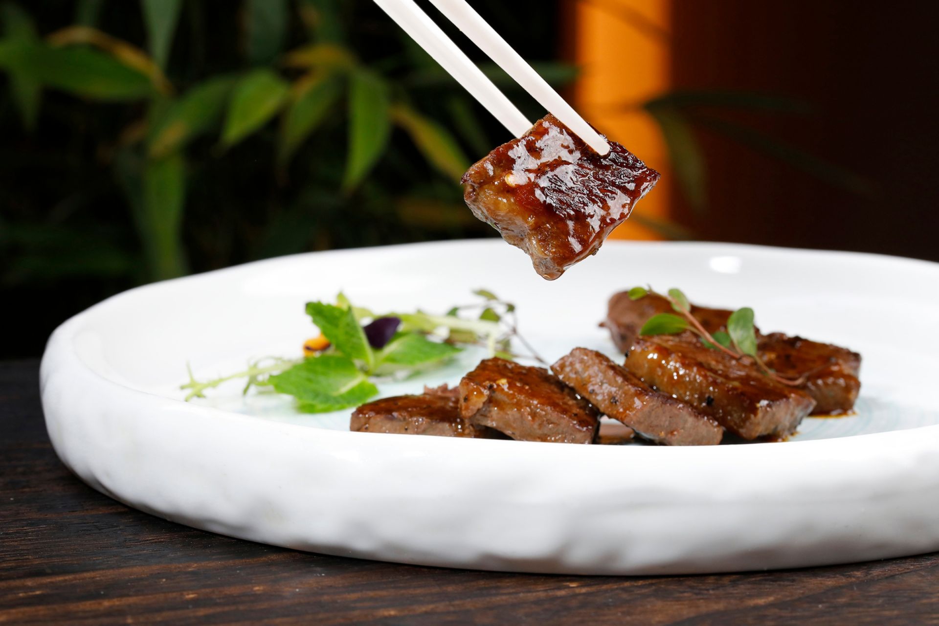 牛肉经过厨师现场200°C石板烹饪,从制作完成到送入口中不到一分钟,极大程度上保证肉质的鲜嫩。每一块雪花牛肉,状似大理石花纹,沾上精心秘制的酱料,入口咀嚼时表皮酥脆,浓郁的汁水在口腔中迸发出美味,带来一种难以言喻的饮食体验。