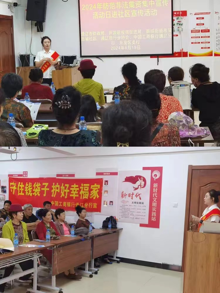 为进一步筑牢人民群众防范非法集资的思想防线,不断提升群众的风险防范意识和非法集资辨识能力,6月15日,工商银行通辽分行联合通辽市财政局、通辽银行业协会、开发区投资促进局、新城街道希望新城社区开展了2024年防范非法集资集中宣传活动。