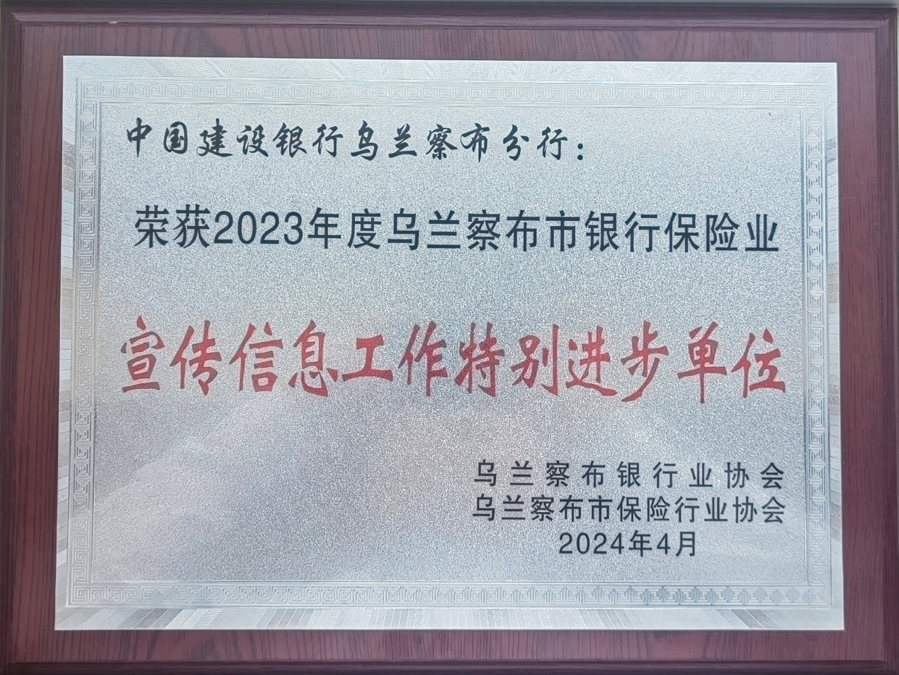 近日,乌兰察布银行业协会印发了《关于表彰2023 年度乌兰察布市银行保险业宣传信息工作先进单位的决定》,建设银行乌兰察布分行受到乌兰察布银行业协会通报表彰,协会授予我行“2023年度乌兰察布市银行保险业宣传信息工作特别进步单位”荣誉称号。