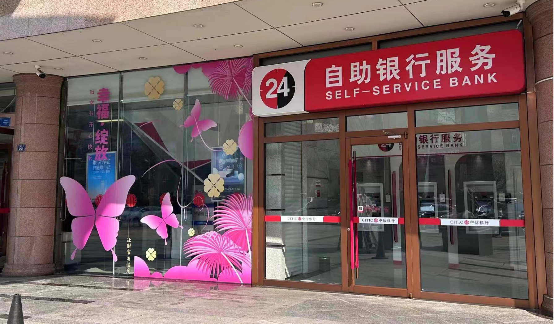 在第114个国际劳动妇女节来临前夕,各地中信银行网点焕然一新,以象征财富、健康、真爱、陪伴的四叶草形象和粉色蝴蝶相结合,亮相全国150余个大中城市近千个网点,吸引往来路人驻足打卡拍照。