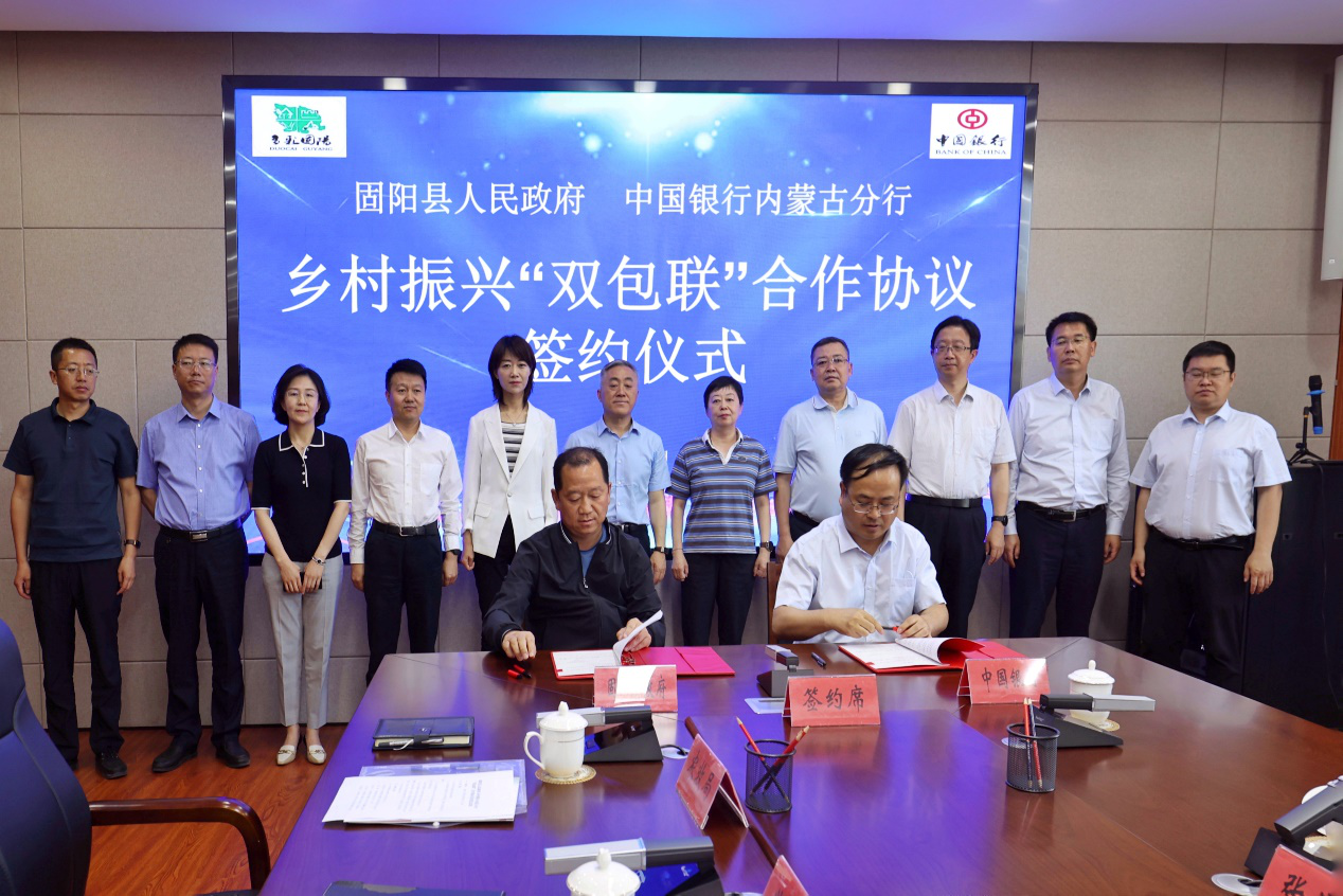 为贯彻落实自治区党委“双包联”工作要求,6月9日,中国银行内蒙古分行与固阳县人民政府在固阳县签署乡村振兴"双包联"合作协议并举行座谈。中国银行内蒙古分行党委委员、副行长雲雯妍、固阳县委书记姚俊杰、县长高瑜等双方领导出席签约仪式。