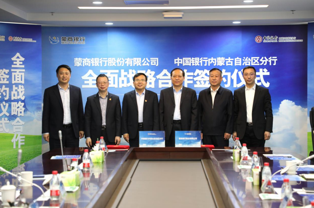 5月11日,中国银行内蒙古分行与蒙商银行签署全面战略合作协议。中国银行内蒙古分行党委书记、行长胡文勇,蒙商银行党委书记、董事长于学忠出席仪式并致辞,中国银行内蒙古分行党委委员、副行长高智,蒙商银行党委委员、副行长廉斌代表双方签署合作协议。