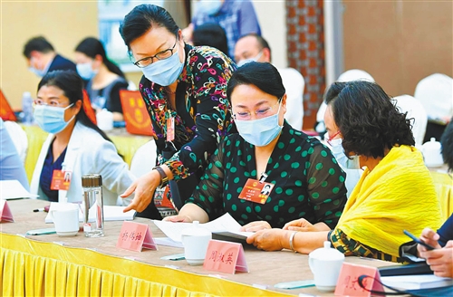 5月26日,人大河北代表团举行会议,审议全国人大常委会工作报告。全国人大代表周淑英、杨伟坤、侯华梅(从右至左)就报告内容展开交流。 赵 威摄(中经视觉)