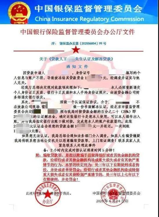 据悉,近期有不法分子以可获得便捷网络贷款、小额贷款等名义联系消费者,诱导消费者下载钓鱼软件进行注册或提供个人信息;然后,提出因消费者提供的信息不符、不实、账户有异等各种理由而导致被银保监会冻结资金。同时,利用伪造的“中国银行保险监督管理委员会办公厅文件”“中国银行保险监督管理委员会关于冻结XX账户的通知”等材料,或银行卡冻结截图等,要求消费者缴纳保证金、认证金等钱款才能解冻账户,并威胁消费者,否则需承担法律责任。