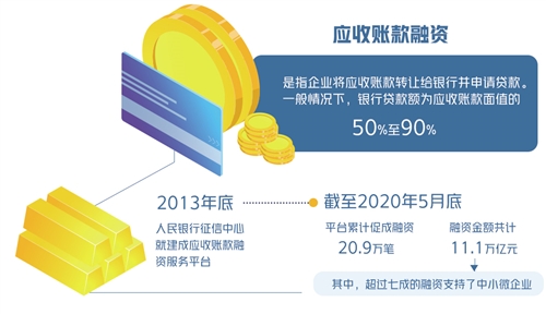 截至2020年5月底,人民银行征信中心组建的应收账款融资服务平台累计促成融资20.9万笔,融资金额共计11.1万亿元,其中,超过七成的融资支持了中小微企业;共有78家核心企业、18个省级和市级财政部门、36家商业银行与平台实现了系统直连。
