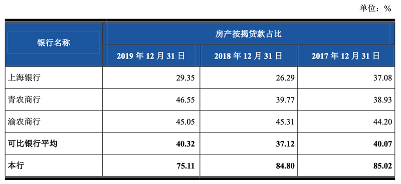 在此次更新的招股书中,上海农商银行将上海银行、青农商行和渝农商行三家作为可比银行,进行了个人贷款产品类型的结构对比。数据显示,截至2019年年底,上海银行、青农商行和渝农商行三家银行的房产按揭贷款占比水平为40.32%,而上海农商银行远超该平均水平,高达75.11%。