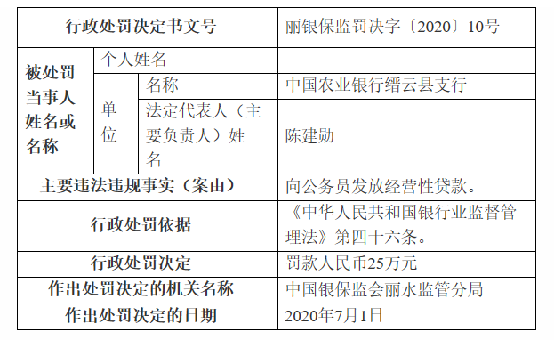 罚单显示,农业银行云县支行存在向公务员发放经营性贷款的违法违规事实。依据《中华人民共和国银行业监督管理法》第四十六条,中国银保监会丽水监管分局对其作出罚款人民币25万元的行政处罚决定。